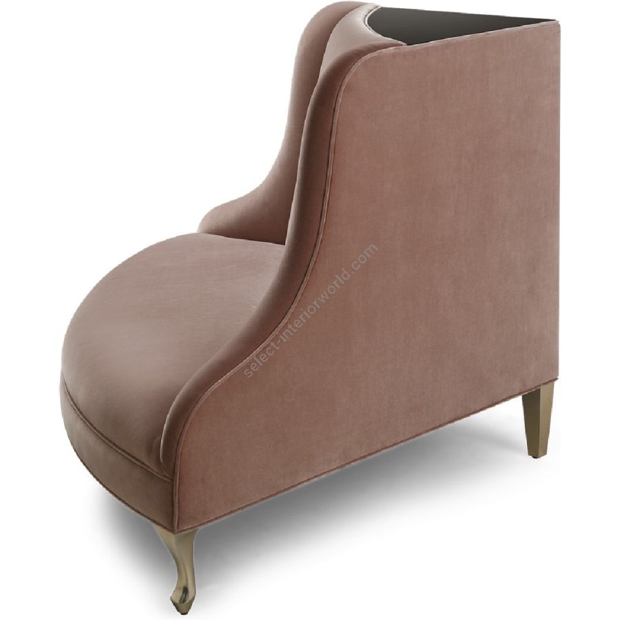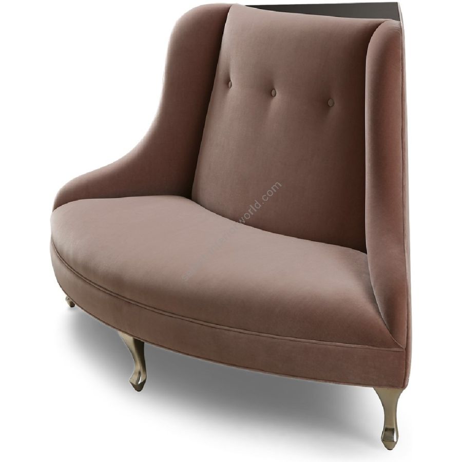 The sweeping cutaway wings of this elegant corner sofa contain a sumptuously upholstered seat with understated back-rest design. The glass top crowning the back-rest offers an ideal pedestal to display flowers or works of art.