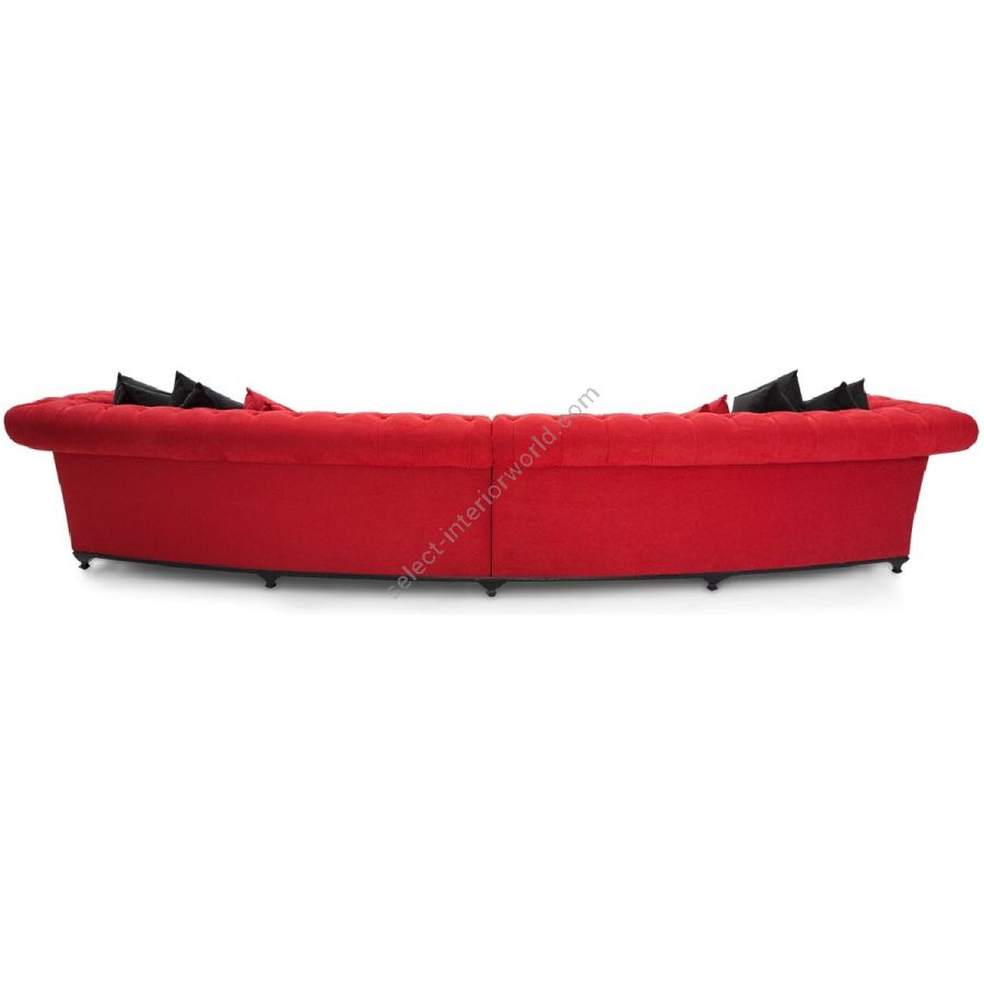 An extravagantly long curved sofa, with a hand carved base, that draws conversation in any setting, a contemporary twist on a timeless design.