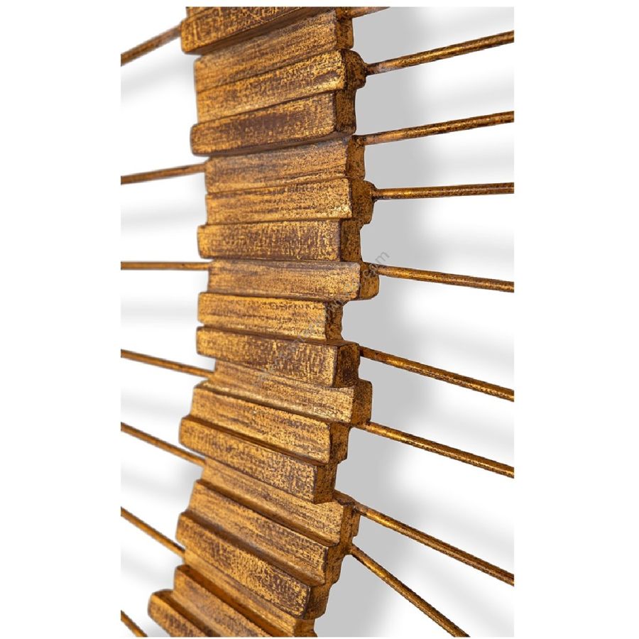 From the Greek word for 'light', this radiant mirror frame is composed of myriad hand carved wood tiles joined by metal connecters in three concentric shimmering circles. A superstar of a piece!