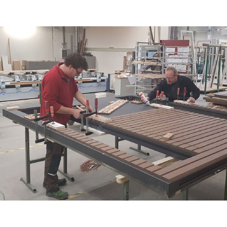 With this door our carpenters demonstrate their craftsmanship. Each door is planned and drawn according to your design requirements. The oak / spruce / fir slats are individually oiled, glazed or colour-varnished at the customer‘s request and then mounted on the door double. The doubling panel itself can be colour-matched depending on the surface of the plates and fittings, a wide range of customizations are possible.