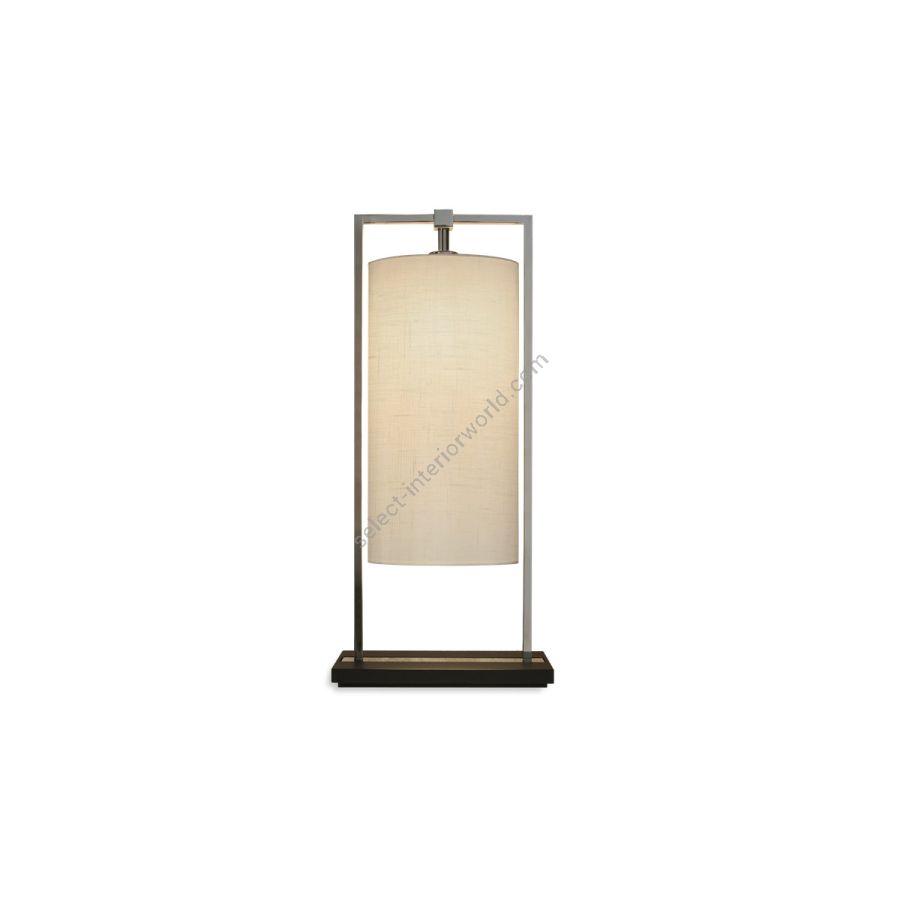 Athena is a table lamp characterised by rectangles (the base) and ovals (the shade), which complement each other. The shade can be made with highly tactile fabrics: marble effect or white cotton, for a couture touch. The base is in dark-brown stained oak, with polished nickel finish inserts to emphasise a sense of balance. Athena is versatile piece that easily adapts to different contexts.