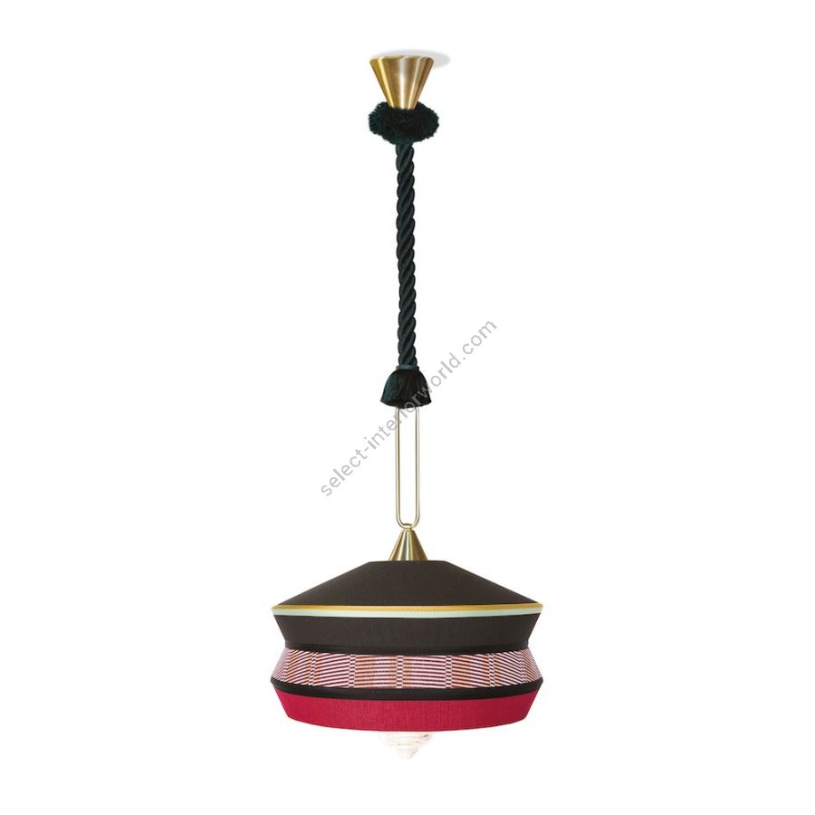 Calypso is a collection of suspension lights inspired by the art deco period, with fabrics whose textures and geometric patterns in black and white mixed with bright colours inspired by the South American and tropical culture, proves a very original result. The indoor version is characterized by a green braided silk cord. The support is a satin brass ring. The diffuser is in transparent glass.