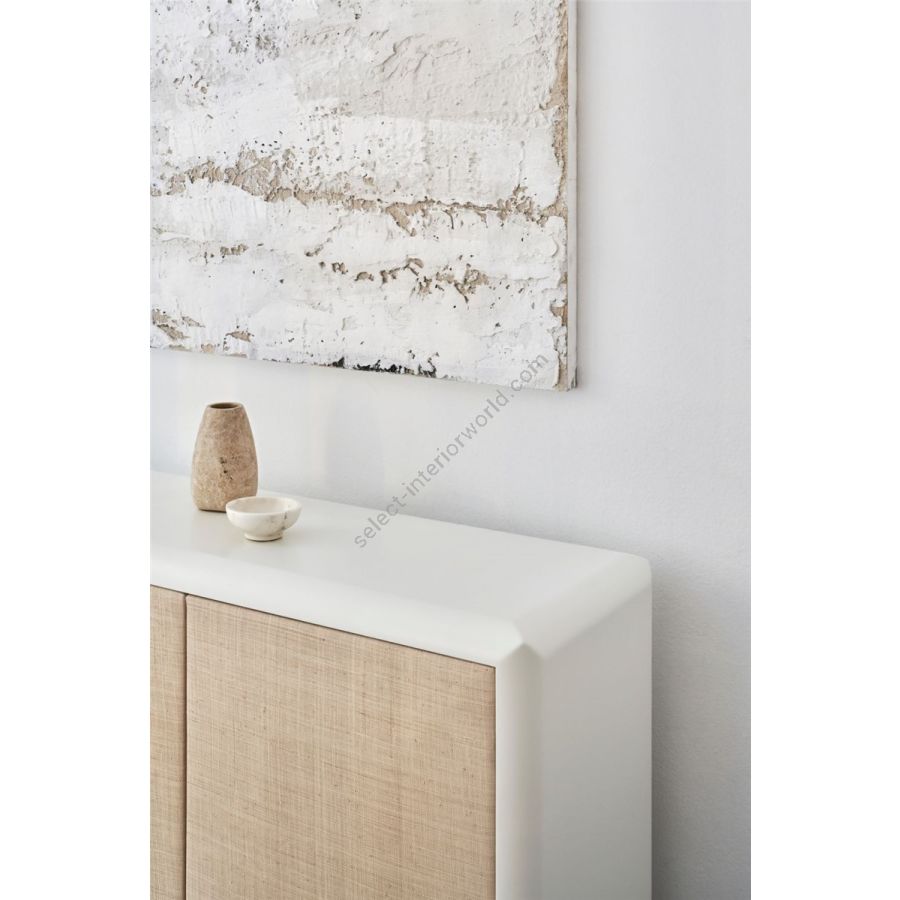Structure and interiors in white/ivory/black mat lacquered. 2 compartments, 1 internal shelf for each compartment. Four doors covered in raffia sand/camel with push-pull opening.| Dimensions (HxWxD): | cm: 80x230x46 / inch: 31.5"x90.55"x18.11" |