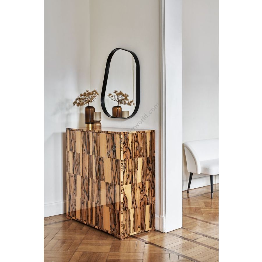 Reinterpreting the concept of traditional storage in an eye-catching design, this exclusive cabinet will be the focal point in a modern living room and dining room. The luxurious checkerboard pattern is crafted by masterfully assembling Albin wood pieces, whose stunning natural wood grains are enhanced by a gloss finish. The two doors have a push and pull opening system to preserve the harmony of the design and reveal an interior storage of glossy natural maple with two shelves. A piece of great visual impact, this cabinet is best displayed with minimal accents.
