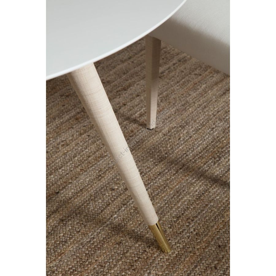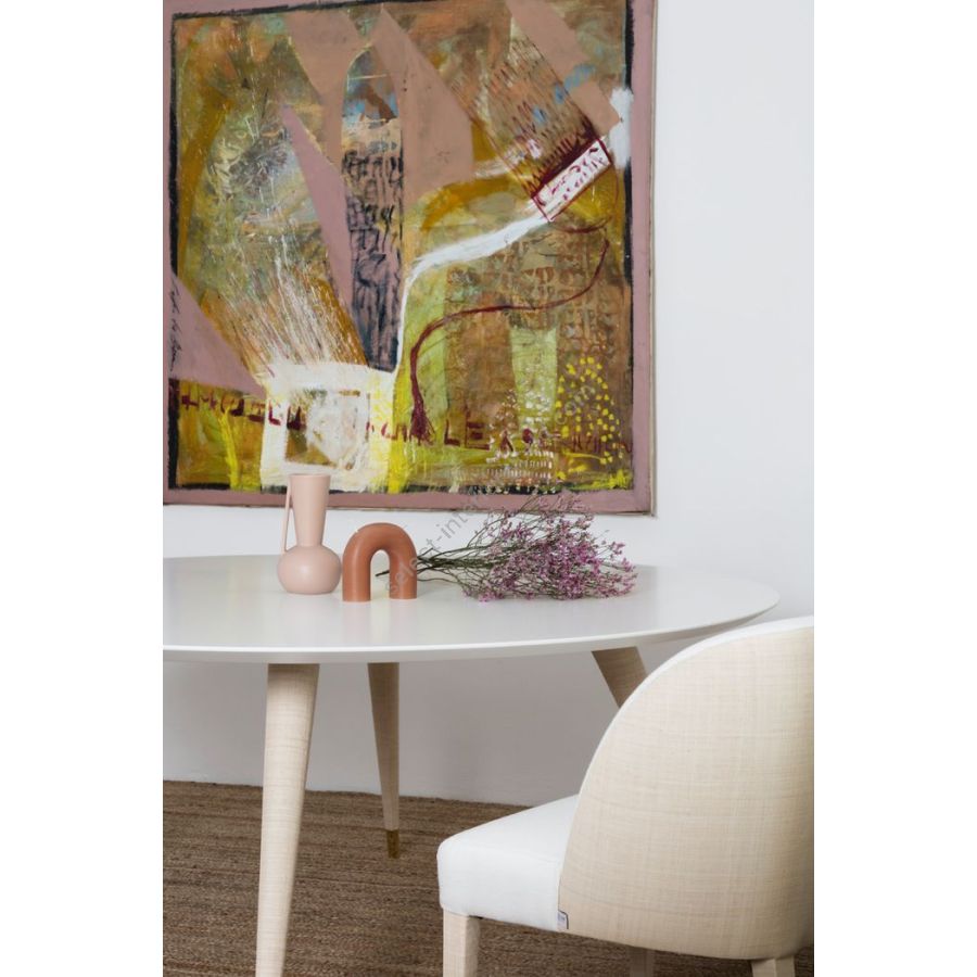 A family of dinner tables, tea tables, coffee tables, bar tables and gueridon ones. Cupertino animates the dialogue that the oak of the tops, natural or stained or lacquered, establishes with the raffia that wraps around the legs as well as with the metals of the tips. In the different versions, with an elliptical or a round beveled top – there is a strong variability in size, but also in personality. Similar to elegant shoes to choose for the evening, the metal tips are available in all DOM Edizioni metal finishes: from sharp and floating chrome to the roughest bronze, passing through the gloss or satin brass.
