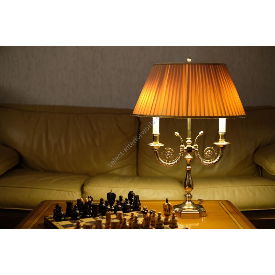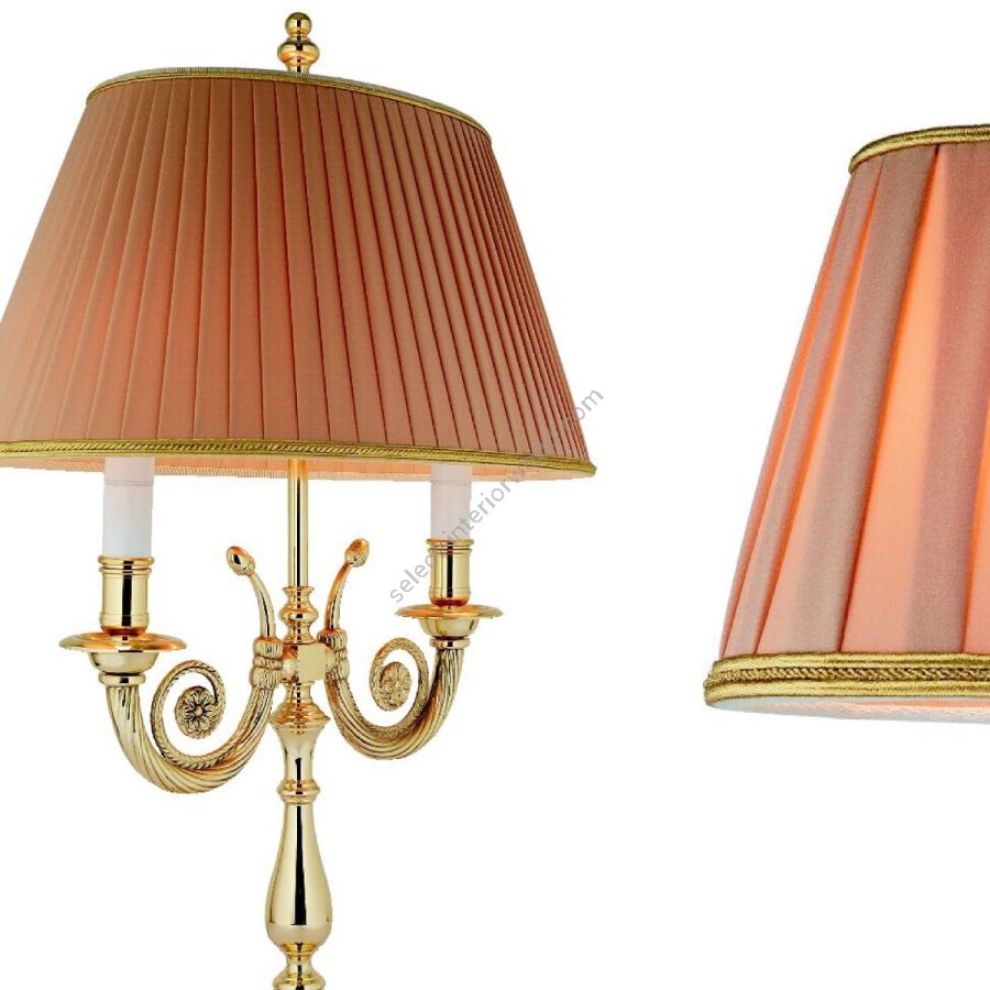 Table lamp in brass with double lights. Fabric lampshade.