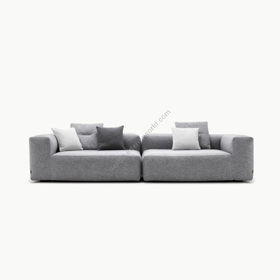 This sofa expands into a wide, low silhouette. Plush padding offers the comfort of interiors in outdoor living. With no legs, it stands as a monolithic block of softness, embodying strength, balance, and refined relaxation.