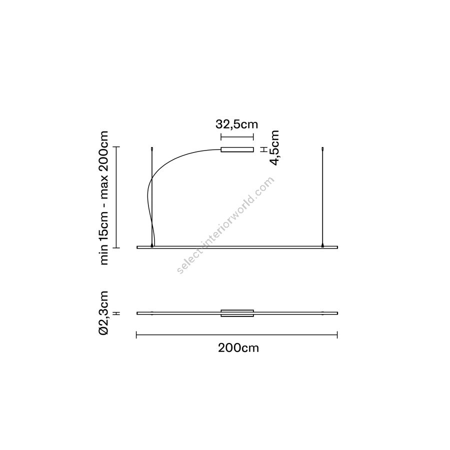 These pendant lamps, made of black anodised aluminium and bronze bars, are available in three sizes. The suspension bars can be oriented for downward or upward illumination. The electrification is mains voltage for LEDs, the power supply is through a driver that can be placed on the ceiling.