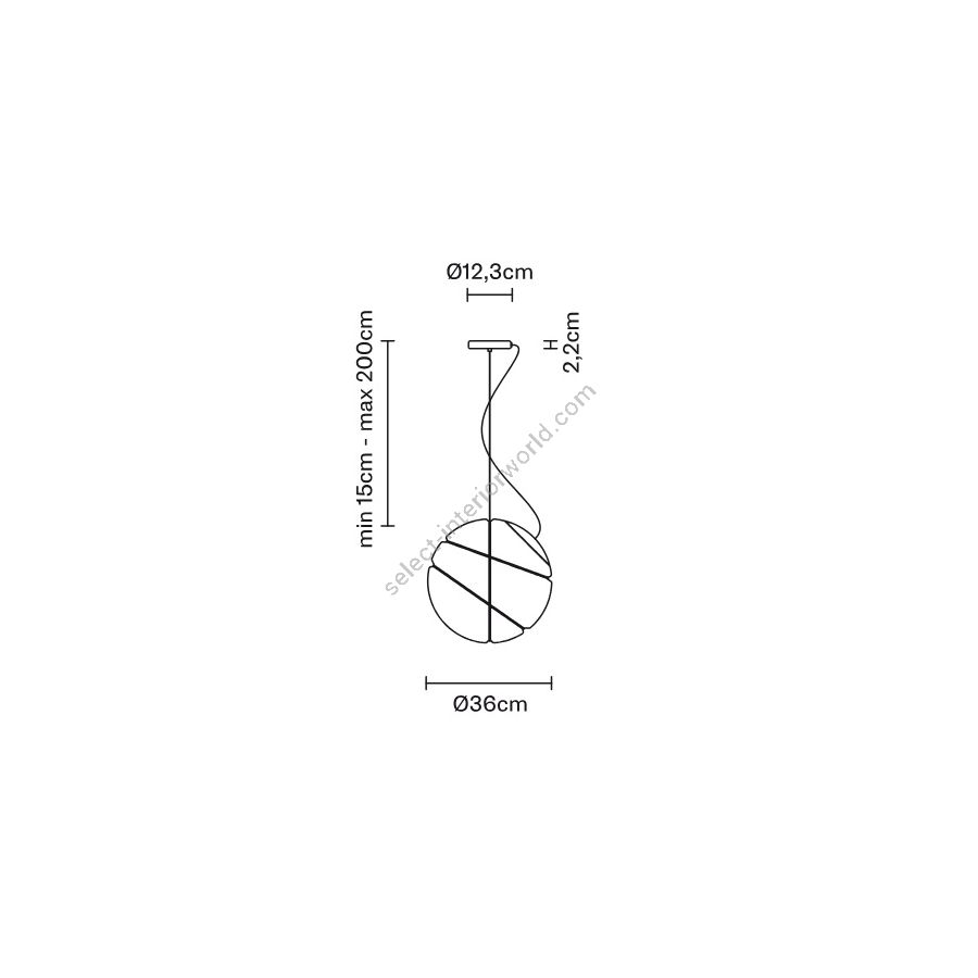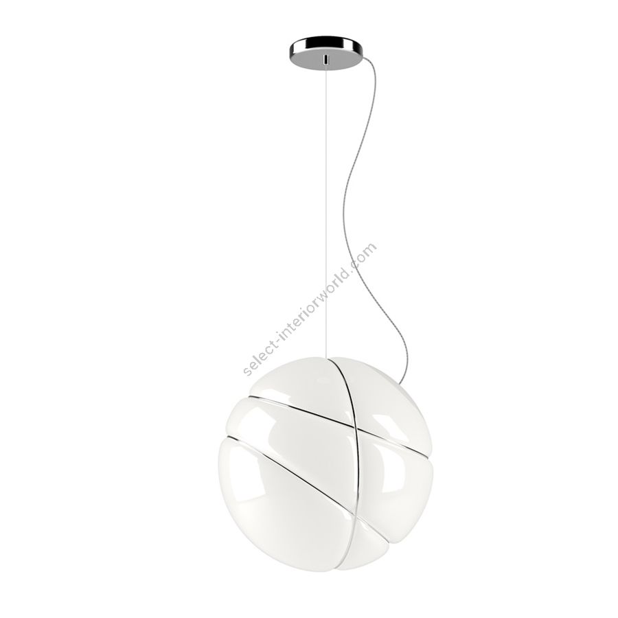 The circles of Armilla recall this custom, support the sphere and enhance the large mass of opal glass that diffuses the light of the light source placed at the center of the composition, just like the armillary spheres imagined by the Copernican cosmographers of heliocentric faith. In detail, the three precious metal rings, appropriately fixed together, contain the diffuser, which, thanks to a small ring fixed to the equator, attaches to the support cable also in metal.