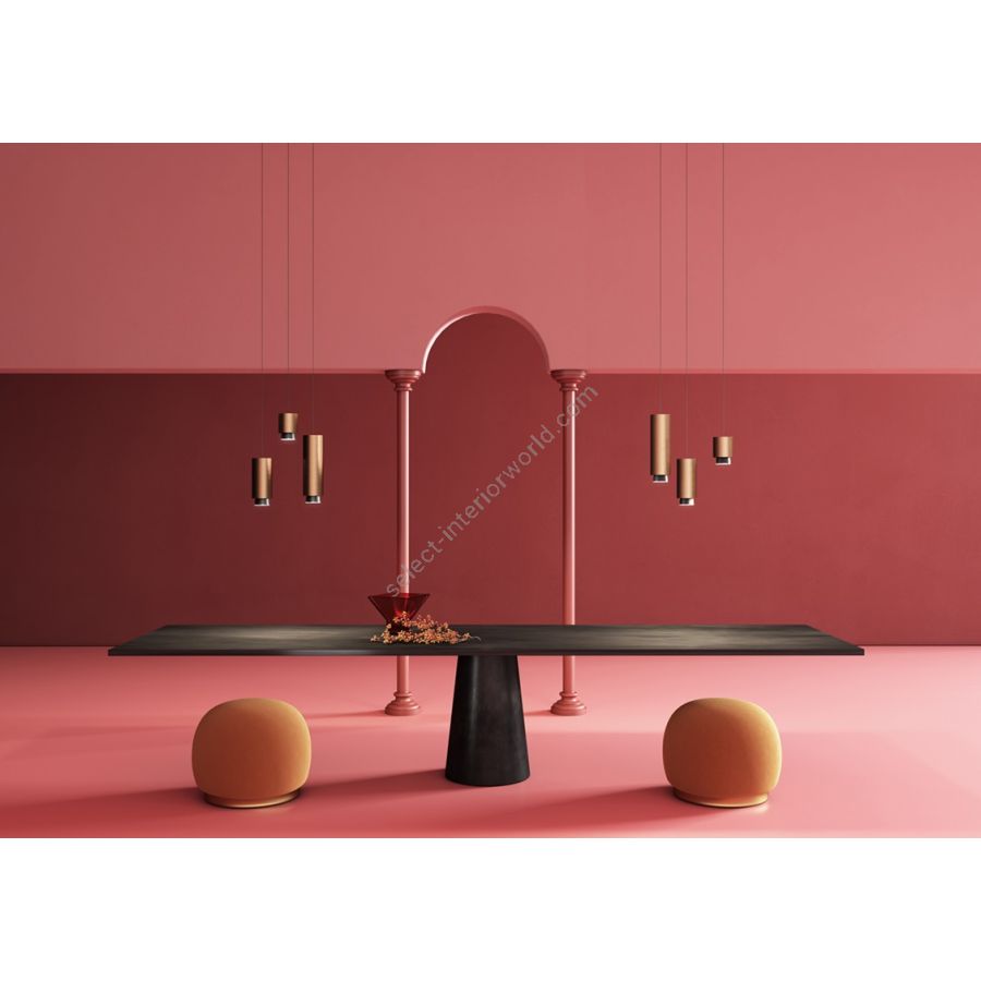 Pendant lamp with bronze anodized aluminum structure and black aluminum detail.