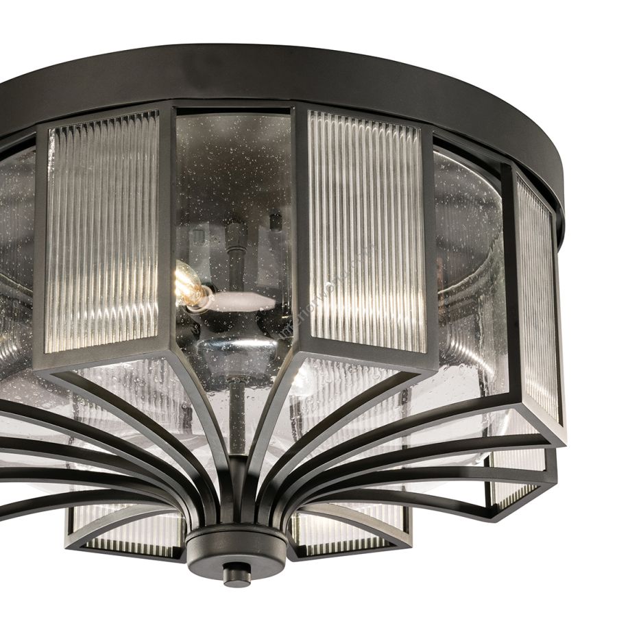 Boldly designed yet quietly subtle, this outdoor flush mount features seedy inner glass with an overlay of reeded glass panels. Offered in a hand-rubbed black iron finish.