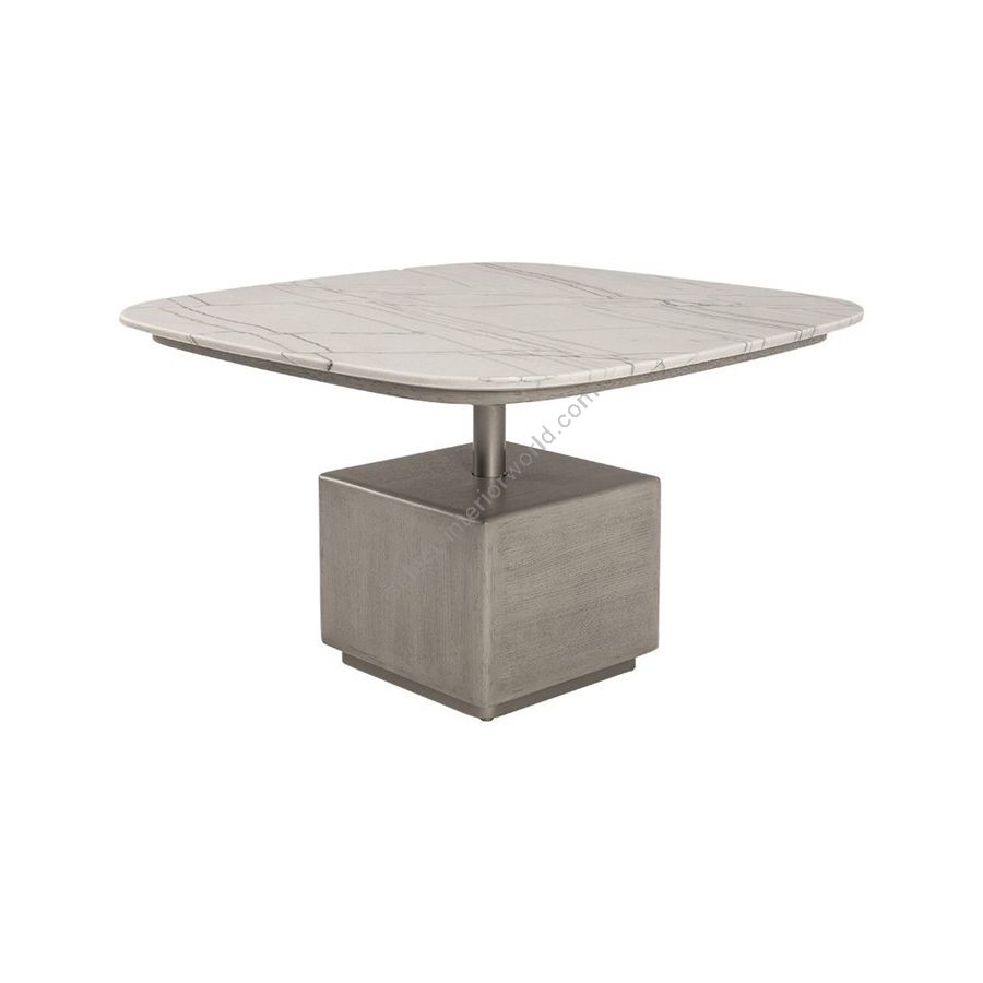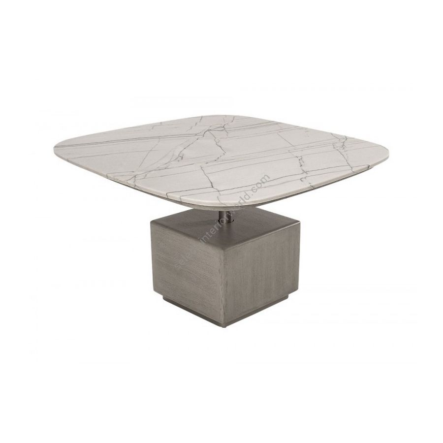 The wooden base has a square shape with rounded corners to complement the shape of the top. In its wooden top version, there is a meeting of radial veneers that resembles the cuts of a diamond.