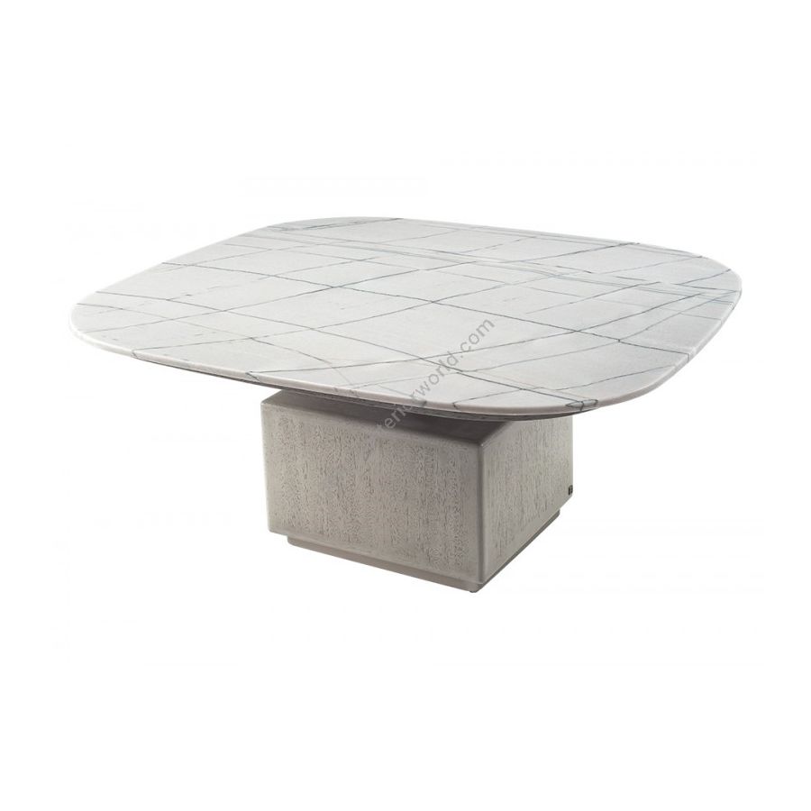 Its wooden squared-shaped base has rounded corners to complement the shape of its top. In its wooden top version, there is a meeting of radial veneers pattern that resembles the cuts of a diamond.