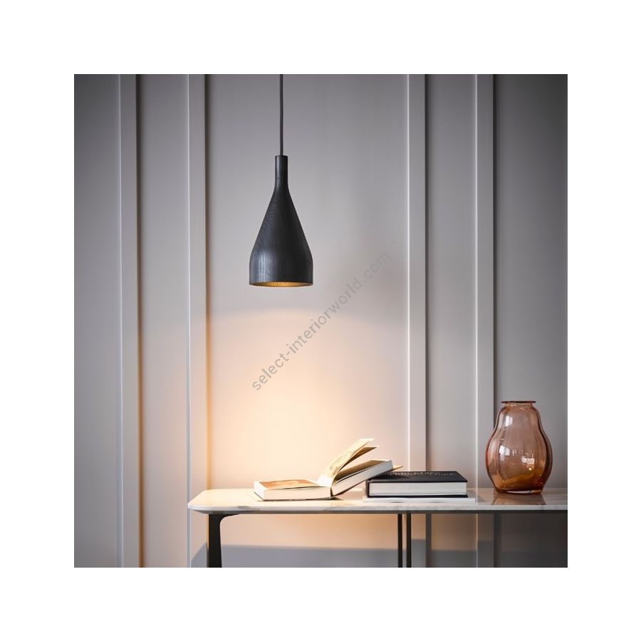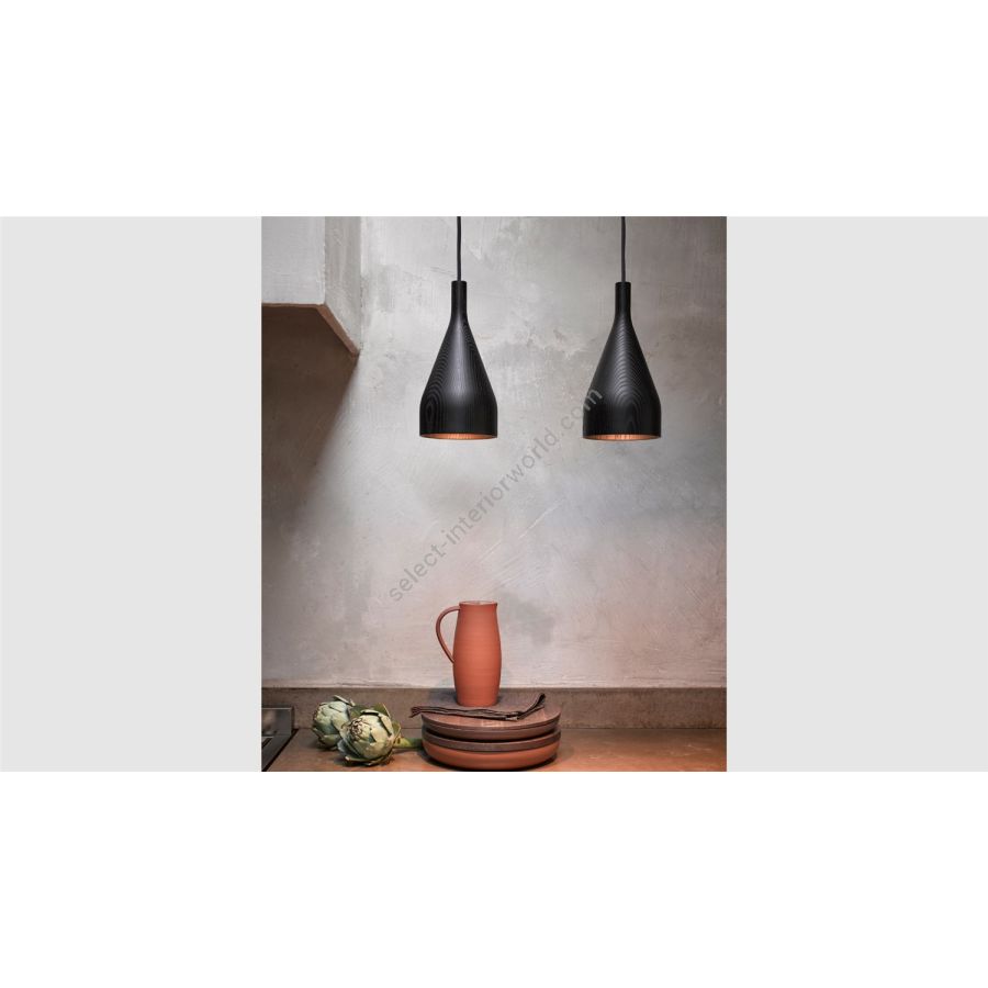 The Timber shade is expertly turned from a single piece of wood. For this collection, three high-quality varieties of wood are used: ash, oak and walnut. A subtle black paint is applied to the ash wood version, leaving the elegant wood lines visible. The cables come with a matching casing of black linen. The pendant light is assembled in the workshop of a social enterprise in The Hague by individuals who fall outside the labour market.