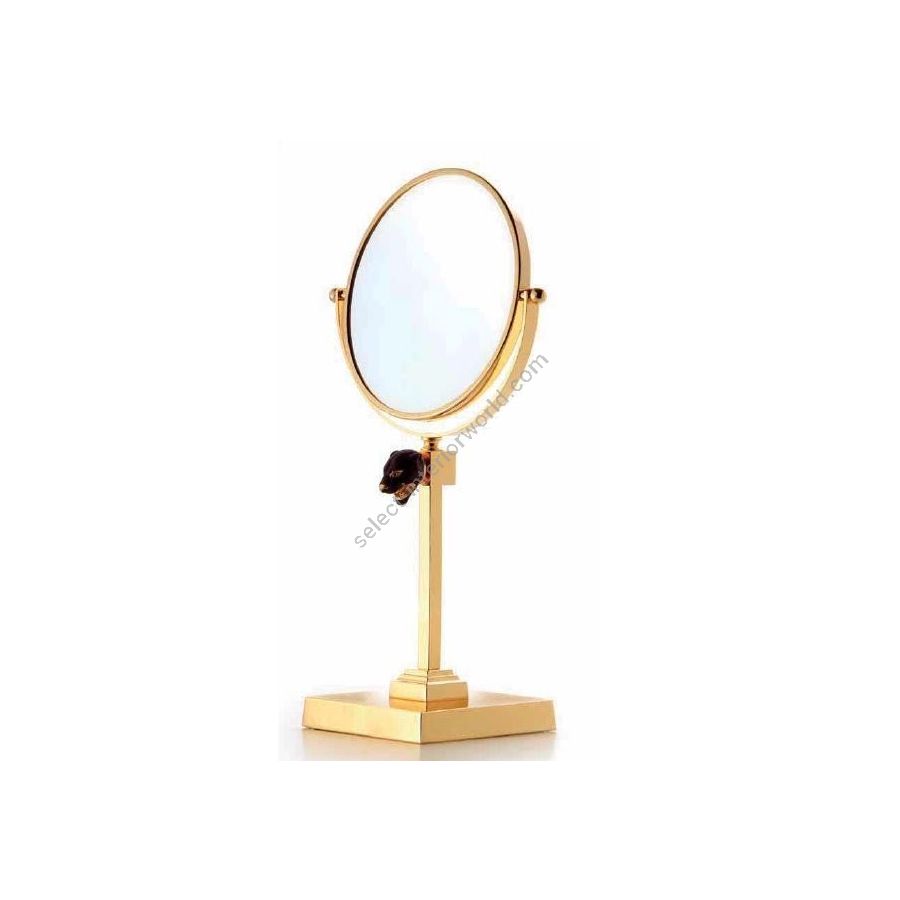 Table mirror brass with magnifying (2x) in gold 24k with micro casting of enameled brass panther. Functional elements that create an extremely elegant, welcoming and high-value bathroom.