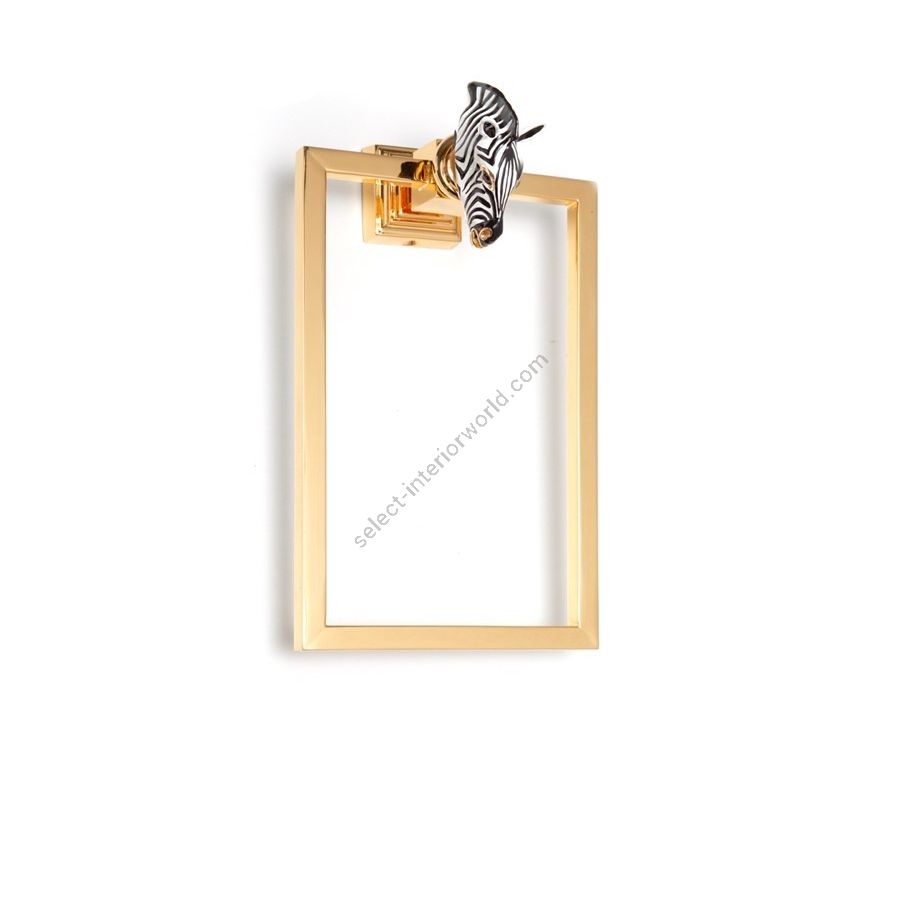 Square towel holder in gold 24k with micro casting of enameled brass zebra. Functional elements that create an extremely elegant, welcoming and high-value bathroom.