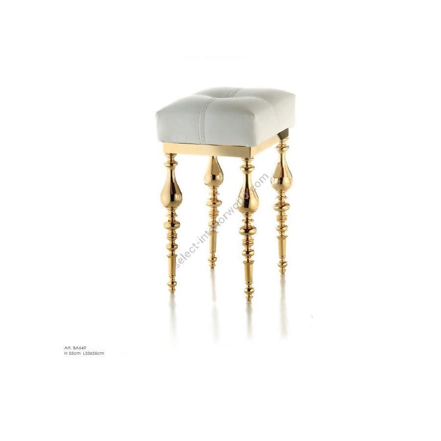 Stool/pouff for bathroom in cast golden brass and padded faux leather. Functional elements that create an extremely elegant, welcoming and high-value bathroom.