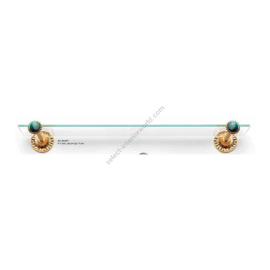 Glass shelf in dotted diamond brass and malachite cabochon. Functional elements that create an extremely elegant, welcoming and high-value bathroom.