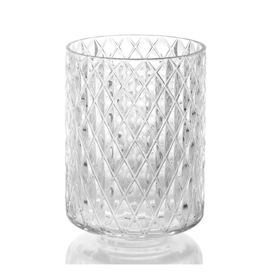 Italian hand-cut crystal set with three-dimensional rhombus pattern. Waste basket. Functional elements that create an extremely elegant, welcoming and high-value bathroom.