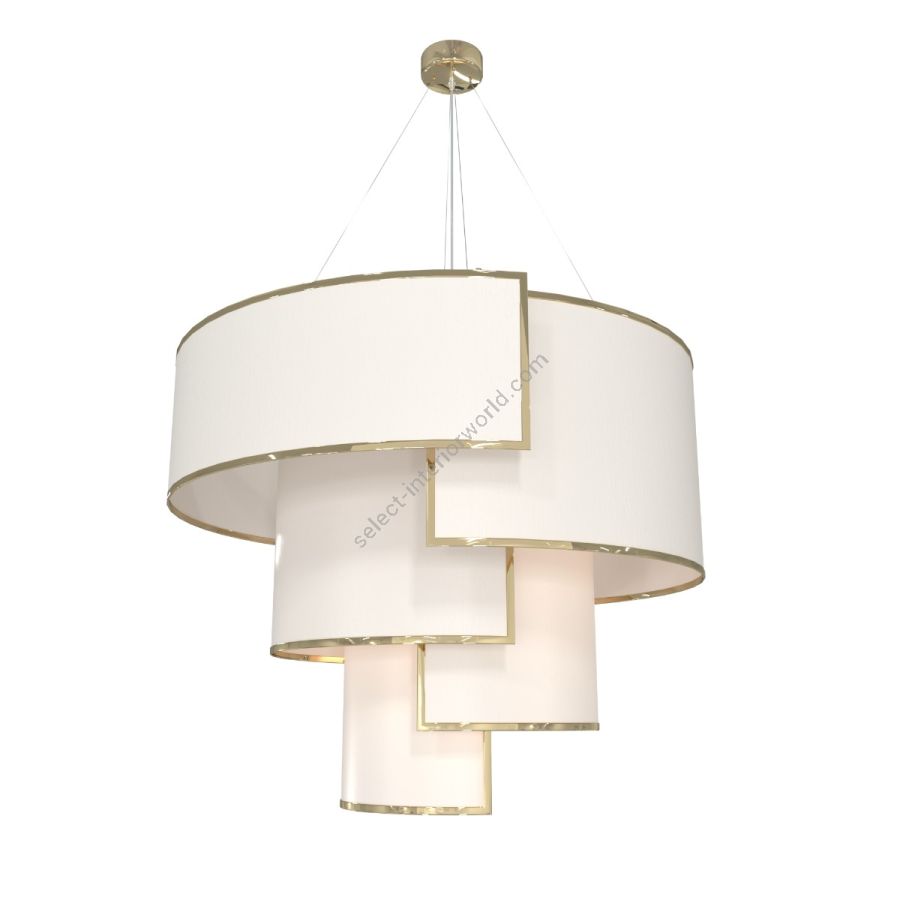 Chandelier in polished brass alternating with old gold finishing with Ivory fabric. Lighting item that diffuses the light with great effect in the surrounding environement creating a warm and welcoming atmosphere.