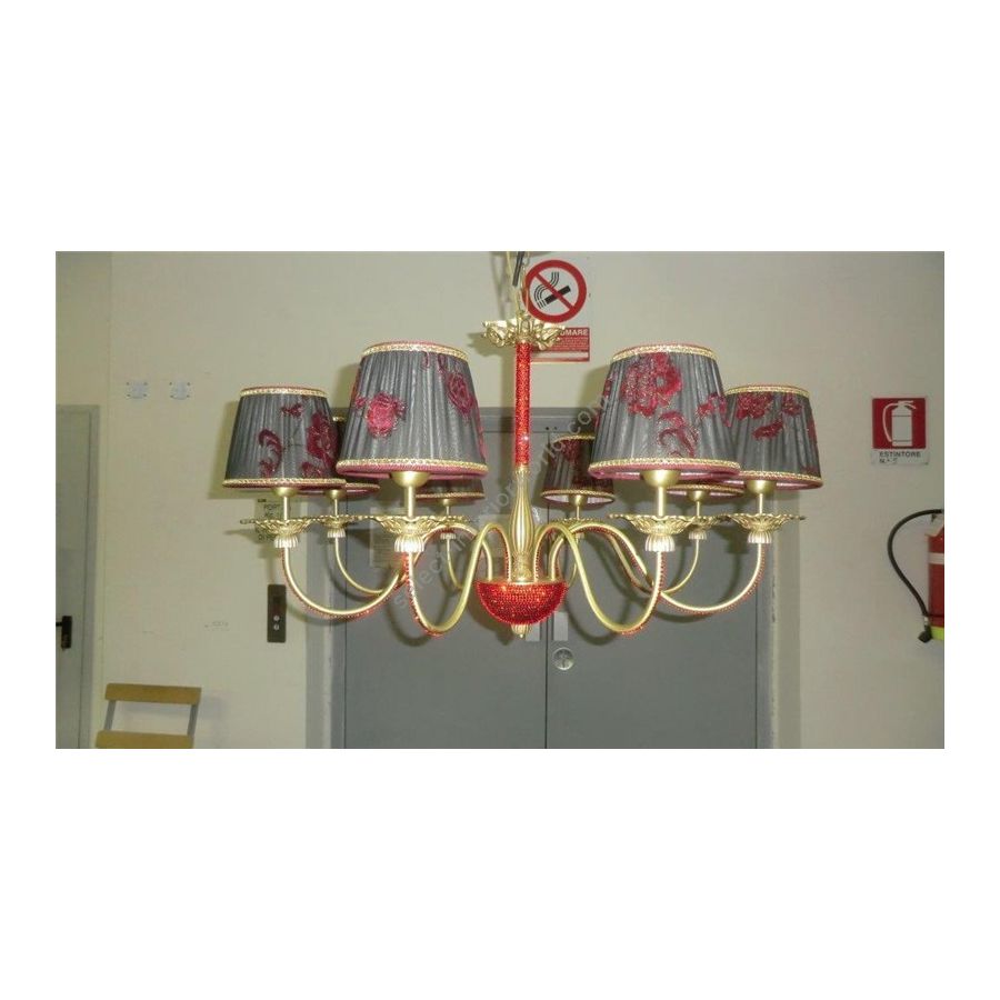 Chandelier in brass with application of strass and fabric lampshades. Lighting item that diffuses the light with great effect in the surrounding environement creating a warm and welcoming atmosphere.