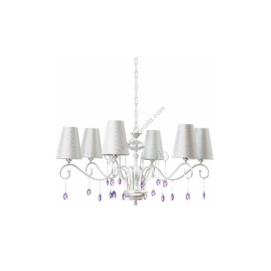 Chandelier in light silver brass with violet crystal pendants and silver fabric lapshades. Lighting item that diffuses the light with great effect in the surrounding environement creating a warm and welcoming atmosphere.
