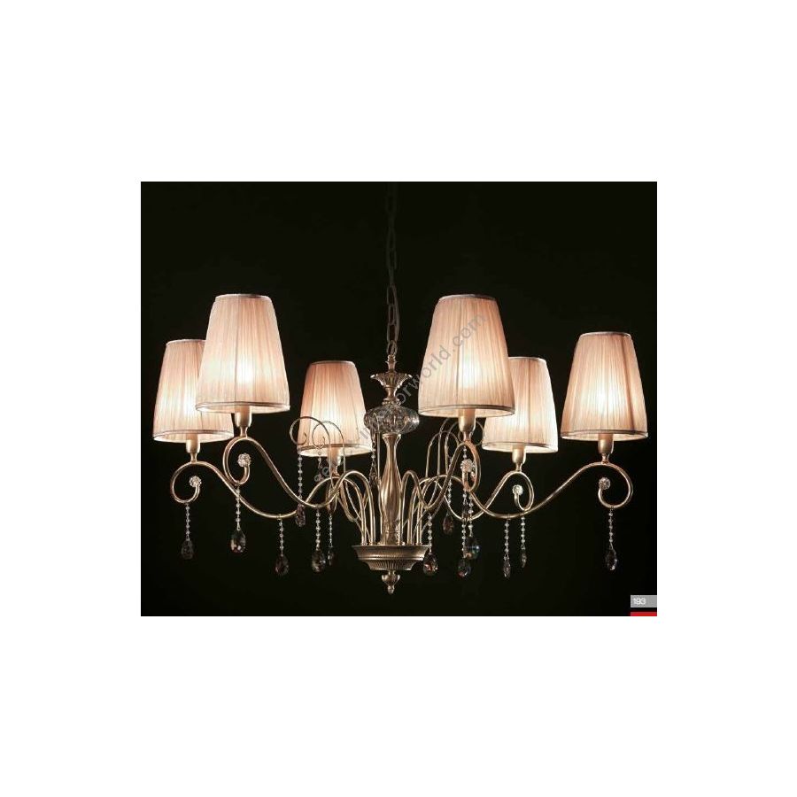 Chandelier in brass with coloured crystal pendants and fabric lapshades. Lighting item that diffuses the light with great effect in the surrounding environement creating a warm and welcoming atmosphere.