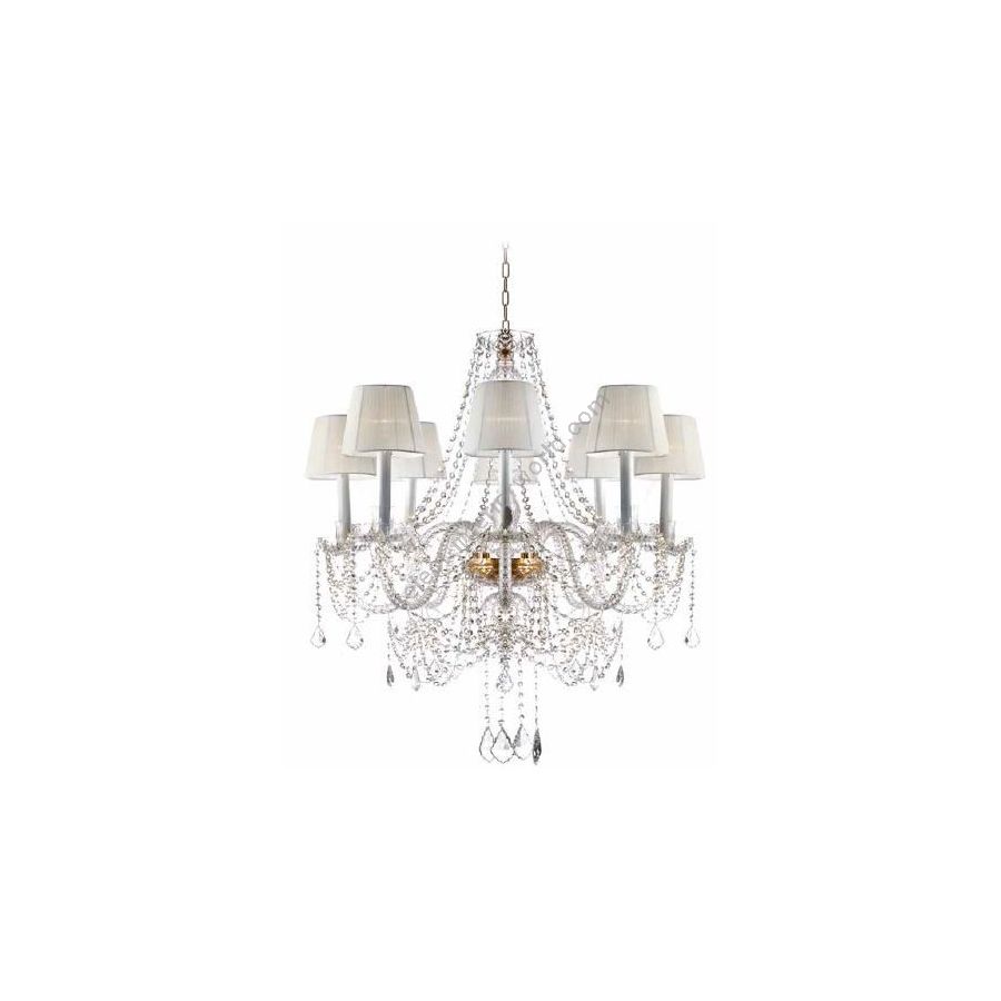 Chandelier 8 lights in clear glass with decorations in crystal and Asfour crystal pendants. Double fabric lampshades. Lighting item that diffuses the light with great effect in the surrounding environement creating a warm and welcoming atmosphere.