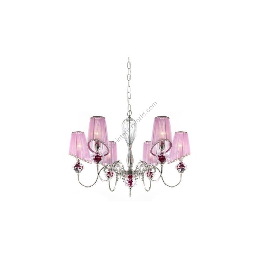 Chandelier with lillac lampshades and hand-made crystal roses. Lighting item that diffuses the light with great effect in the surrounding environement creating a warm and welcoming atmosphere.