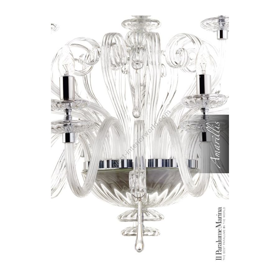 15 lights chandelier in clear Murano glass. Lighting item that diffuses the light with great effect in the surrounding environement creating a warm and welcoming atmosphere.