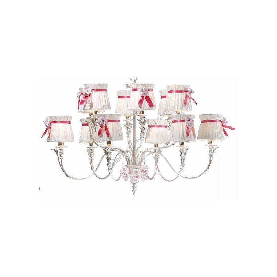 12 lights Chandelier in cast brass with pink Murano glass flowers. Included lampshades in double fabric with pink ribbons and glass flowers. Lighting item that diffuses the light with great effect in the surrounding environement creating a warm and welcoming atmosphere.