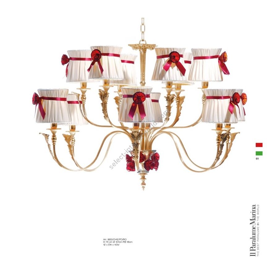 12 lights Chandelier in cast brass with red Murano glass flowers. Included lampshades in double fabric with red ribbons and glass flowers. Lighting item that diffuses the light with great effect in the surrounding environement creating a warm and welcoming atmosphere.