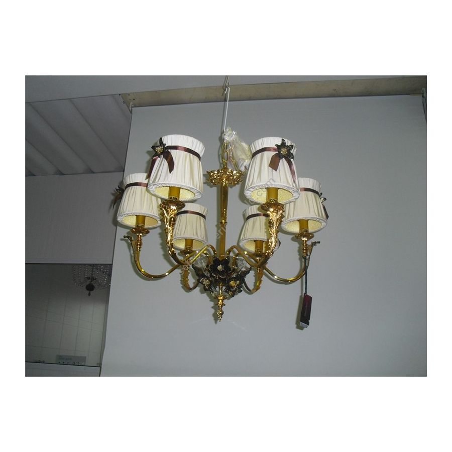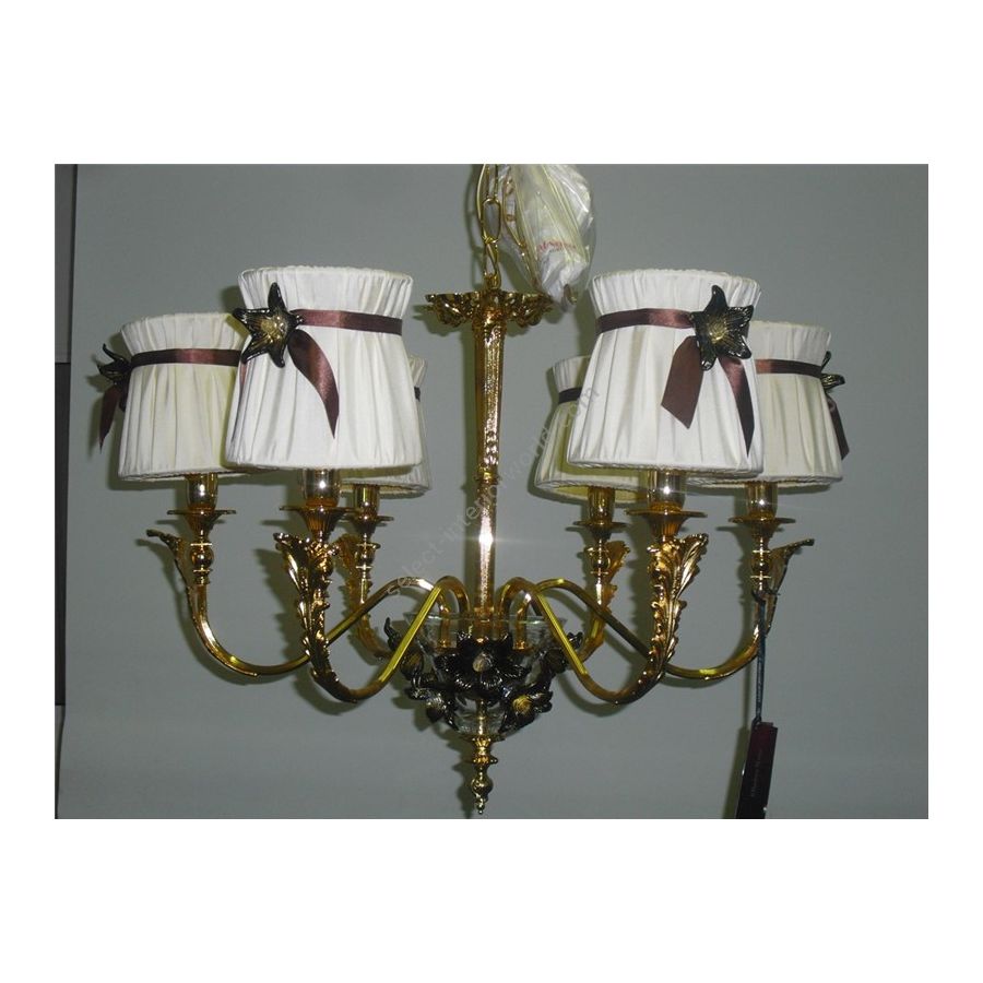 6 lights Chandelier in cast brass with Murano glass flowers. Included lampshades in double fabric with ribbons and glass flowers. Lighting item that diffuses the light with great effect in the surrounding environement creating a warm and welcoming atmosphere.