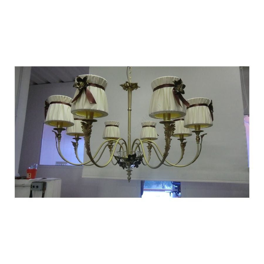 8 lights Chandelier in cast brass with Murano glass flowers. Included lampshades in double fabric with ribbons and glass flowers. Lighting item that diffuses the light with great effect in the surrounding environement creating a warm and welcoming atmosphere.