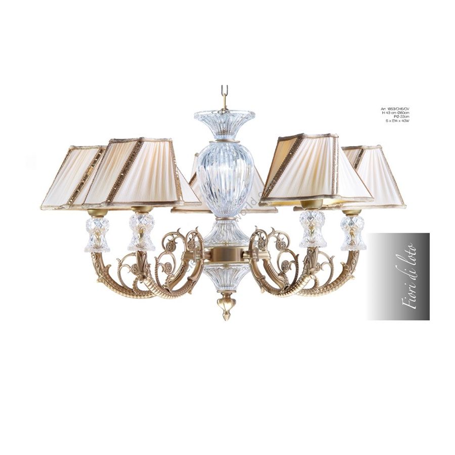 5 lights chandelier in cast brass and Florentine crystal inserts. The lampshades are made in double layer fabric with a sophisticated technique. Lighting item that diffuses the light with great effect in the surrounding environement creating a warm and welcoming atmosphere.