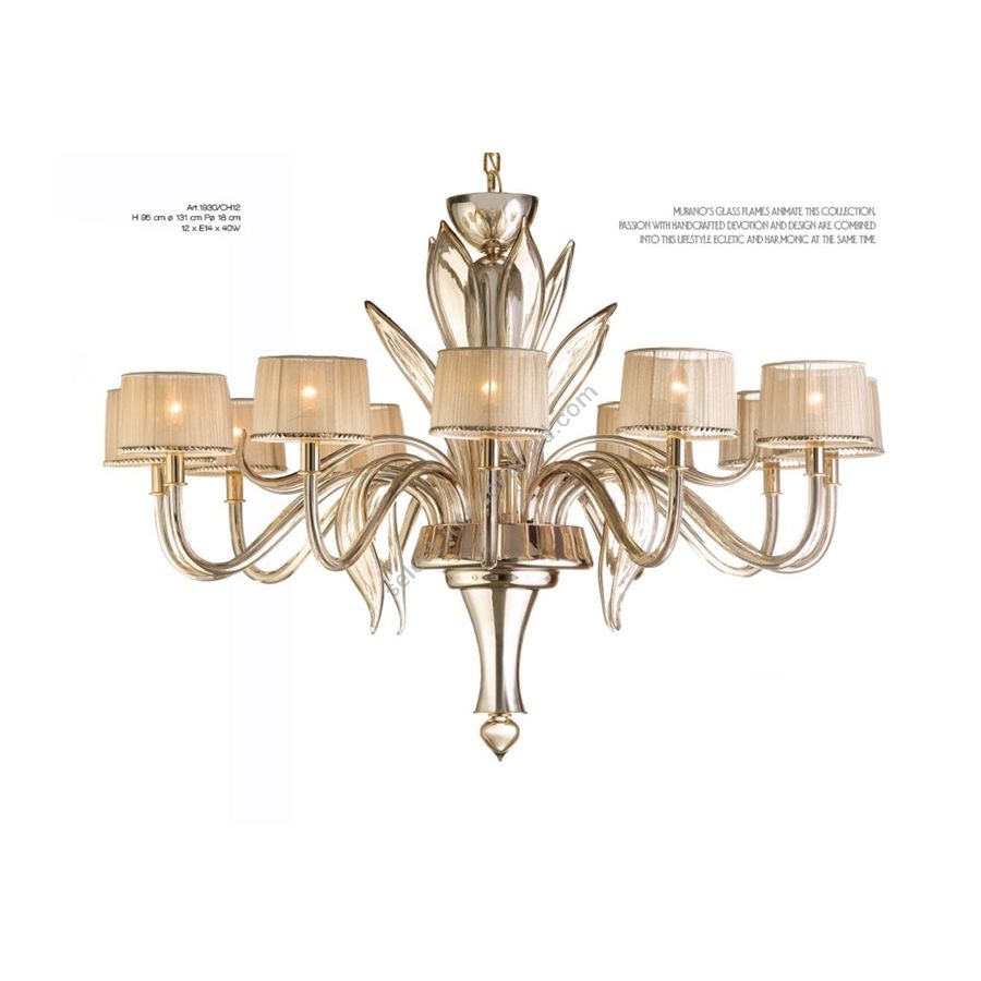 12 lights Chandelier in "Honey" Murano glass+mirror effect. Lighting item that diffuses the light with great effect in the surrounding environement creating a warm and welcoming atmosphere.