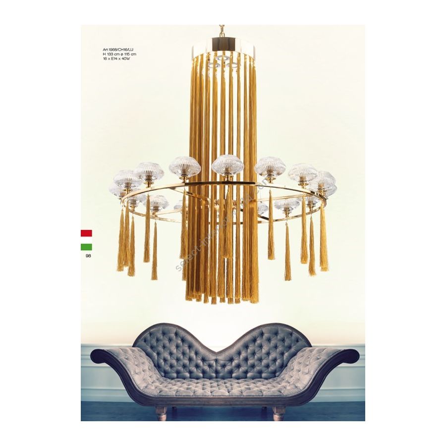 16 lights Chandelier with crystal lampshades and golden tassels. Lighting item that diffuses the light with great effect in the surrounding environement creating a warm and welcoming atmosphere.