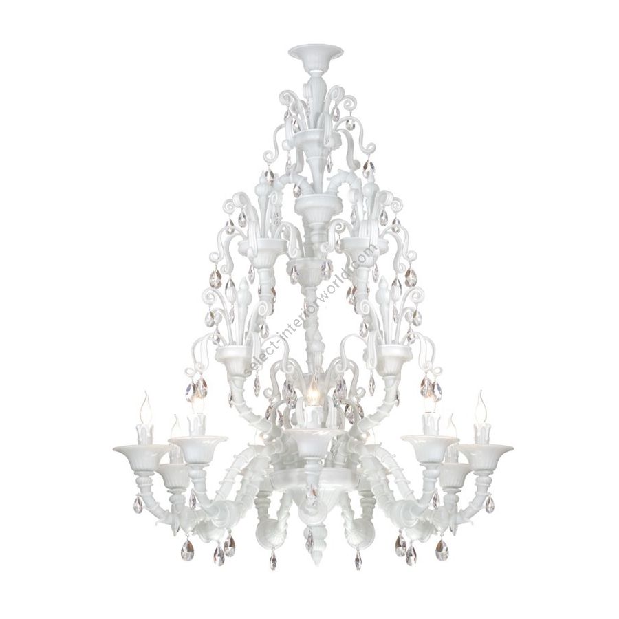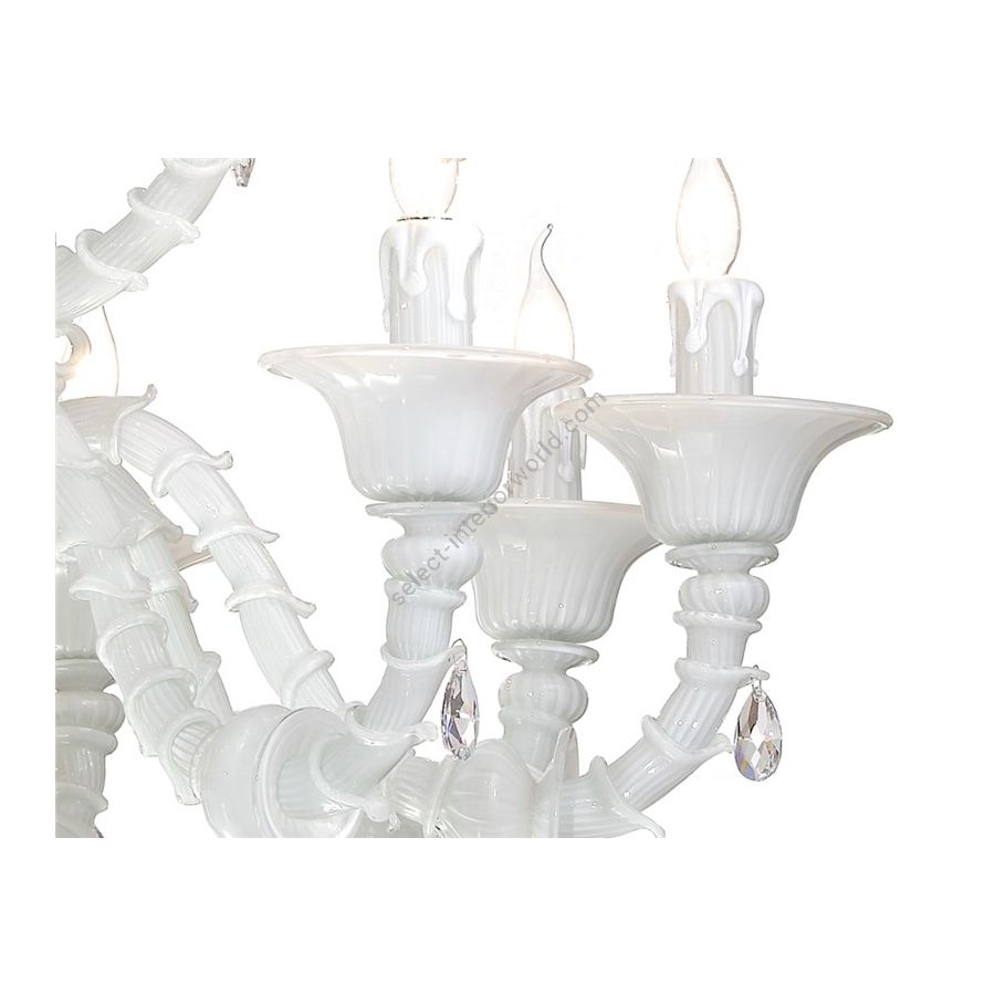 Murano Galss chandelier white with clear crystal pendants. Lighting item that diffuses the light with great effect in the surrounding environement creating a warm and welcoming atmosphere.