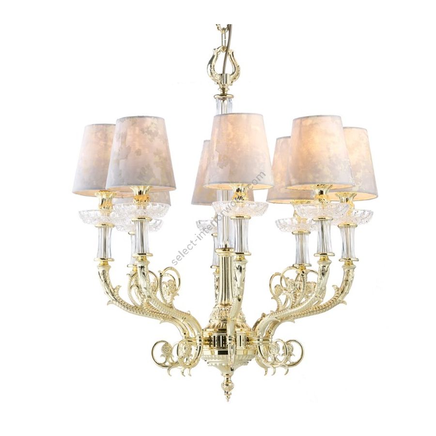 Chandelier in casting brass and Florence crystal elements with lampshades. Lighting item that diffuses the light with great effect in the surrounding environement creating a warm and welcoming atmosphere.