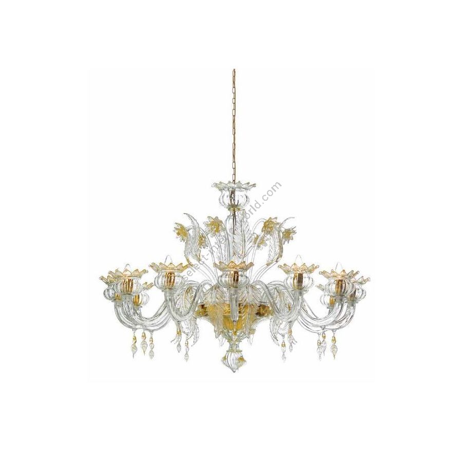 Murano Glass transparent chandelier with decorations in transparent + gold powder. Lighting item that diffuses the light with great effect in the surrounding environement creating a warm and welcoming atmosphere.