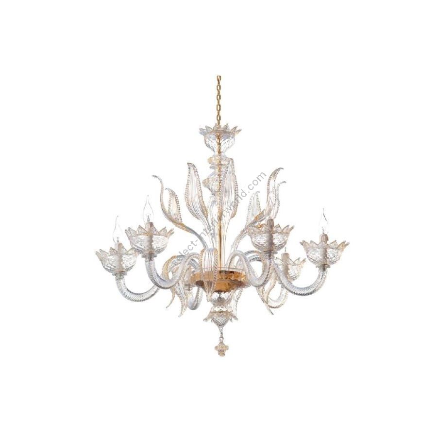 Murano Glass transparent chandelier with decorations in transparent + gold powder. Lighting item that diffuses the light with great effect in the surrounding environement creating a warm and welcoming atmosphere.