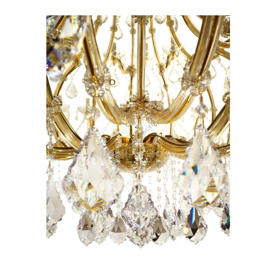 Mariateresa chandelier with Gold plated metal frame covered by transparent glass arms and transparent Crystal pendants. Lighting item that diffuses the light with great effect in the surrounding environement creating a warm and welcoming atmosphere.