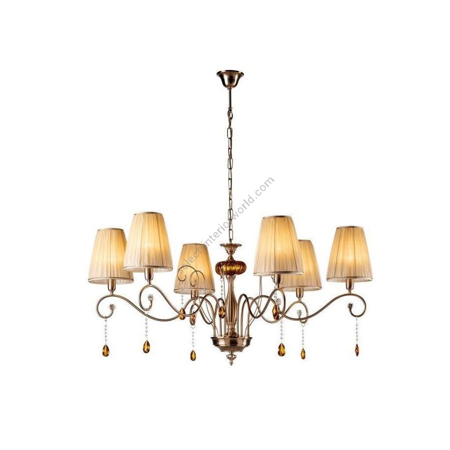 Chandelier in brass with coloured crystal pendants and fabric lampshades. Lighting item that diffuses the light with great effect in the surrounding environement creating a warm and welcoming atmosphere.