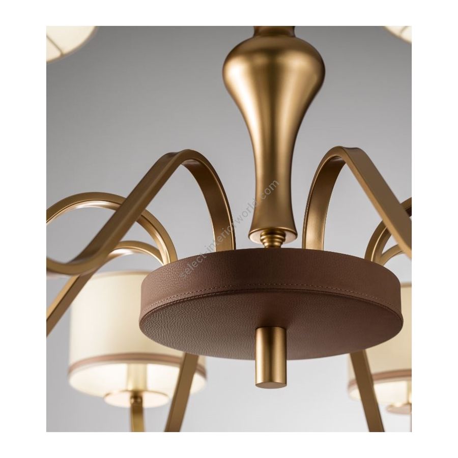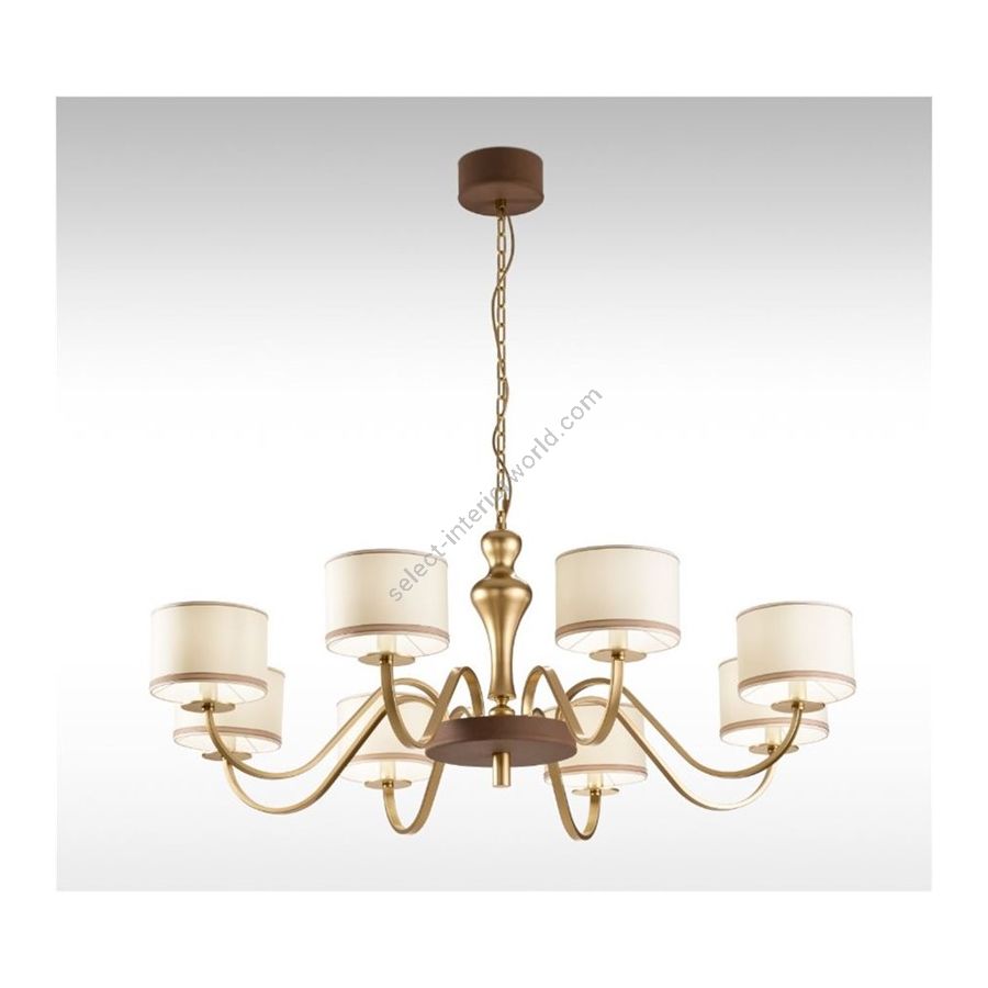 8-light chandelier with a classic and refined design, crafted in metal with a matte gold painted finish. The graceful arms support ivory fabric lampshades that diffuse a soft, enveloping light. A highly elegant decorative piece, ideal for dining rooms, living areas, and representative spaces, combining tradition and contemporary taste with timeless style.