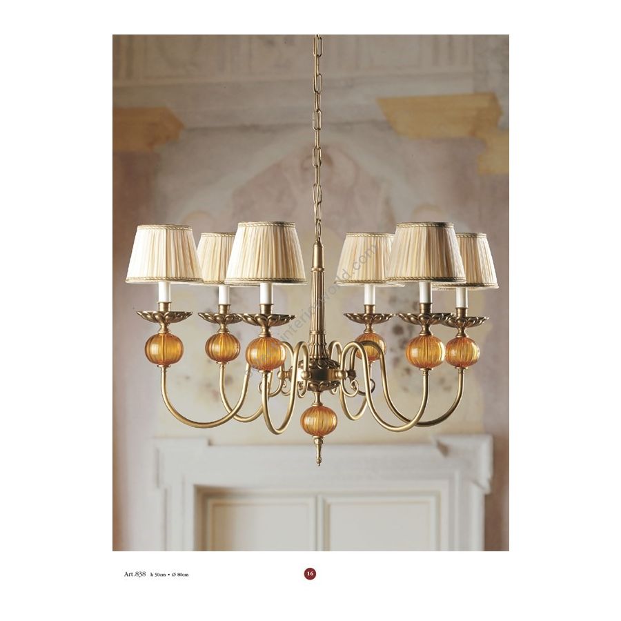 Chandelier 6 lights in brass with inserts of amber Murano glass and fabric lampshades. Lighting item that diffuses the light with great effect in the surrounding environement creating a warm and welcoming atmosphere.