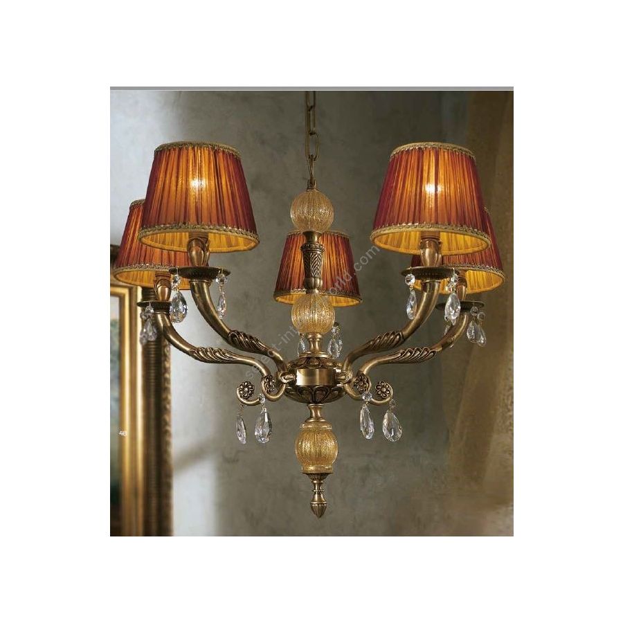 12 lights chandelier in cast brass with decorations in Murano glass and pendant crystals. Lighting item that diffuses the light with great effect in the surrounding environement creating a warm and welcoming atmosphere.