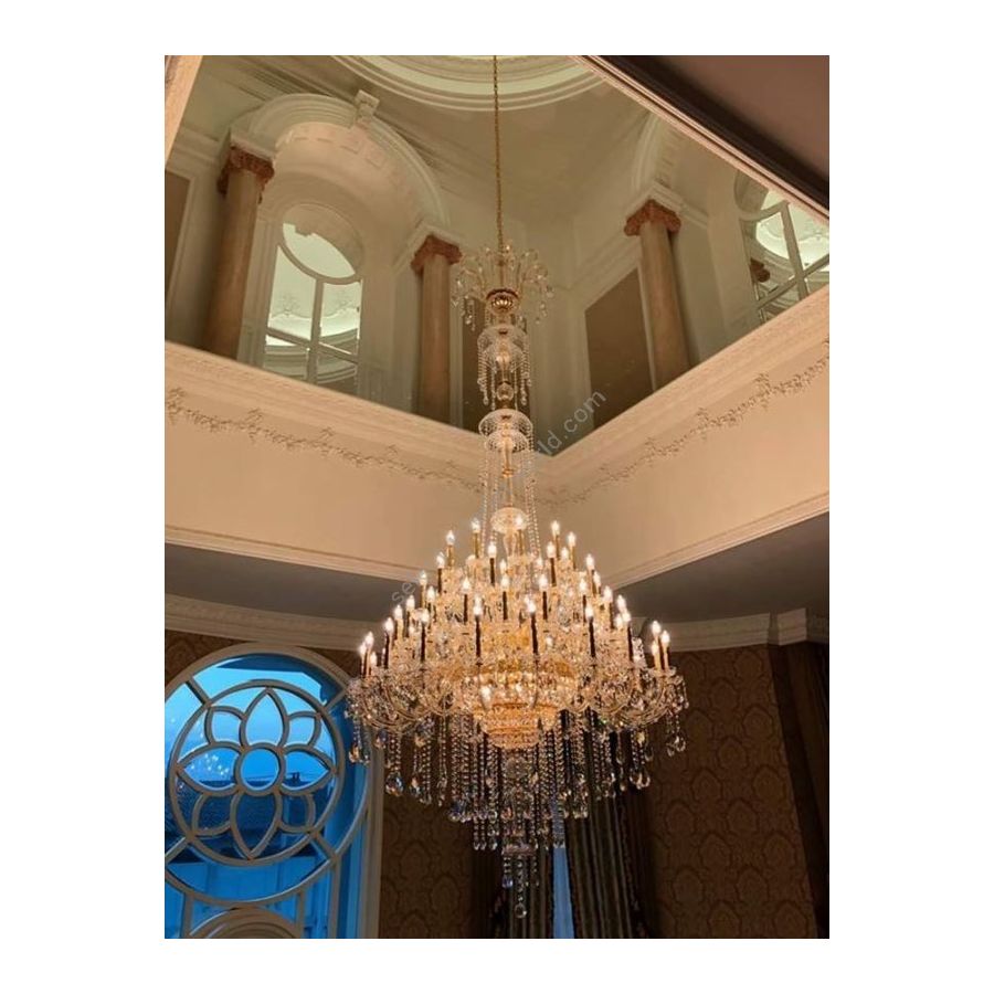 Mariateresa chandelier gold plated metal frame covered by transparent glass, Pendents in transparent Asfour® Crystal. Lighting item that diffuses the light with great effect in the surrounding environement creating a warm and welcoming atmosphere.