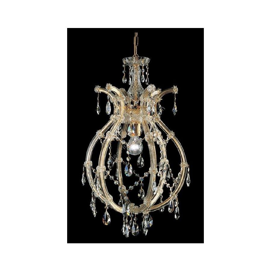 Mariateresa chandelier with Gold plated metal frame covered by transparent glass arms and transparent Crystal pendants. Lighting item that diffuses the light with great effect in the surrounding environement creating a warm and welcoming atmosphere.