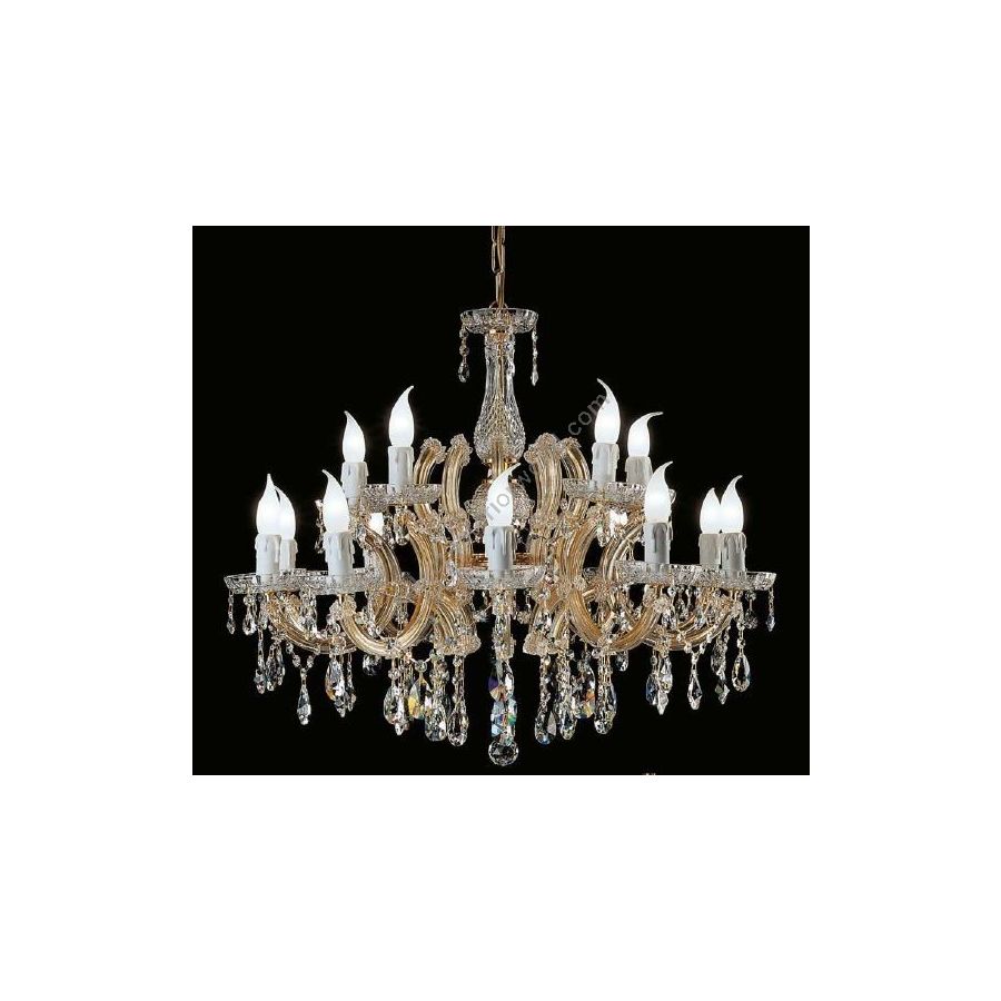 Mariateresa chandelier with Gold plated metal frame covered by transparent glass arms and transparent Crystal pendants. Lighting item that diffuses the light with great effect in the surrounding environement creating a warm and welcoming atmosphere.