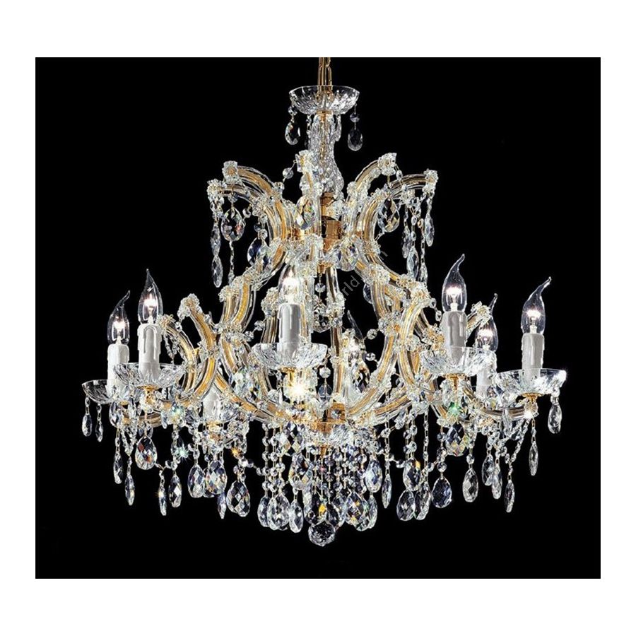 Mariateresa chandelier with Gold plated metal frame covered by transparent glass arms and transparent Crystal pendants. Lighting item that diffuses the light with great effect in the surrounding environement creating a warm and welcoming atmosphere.